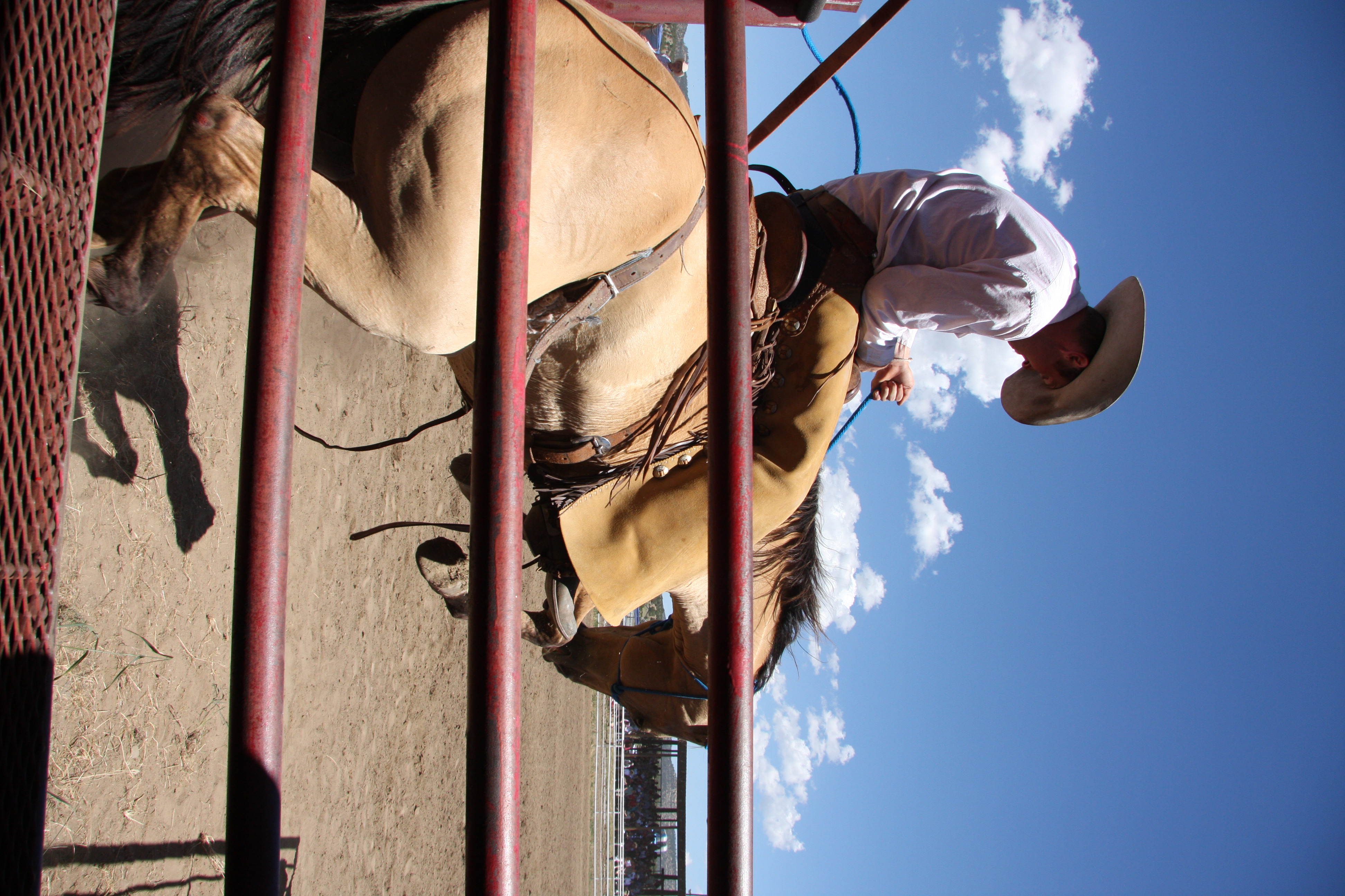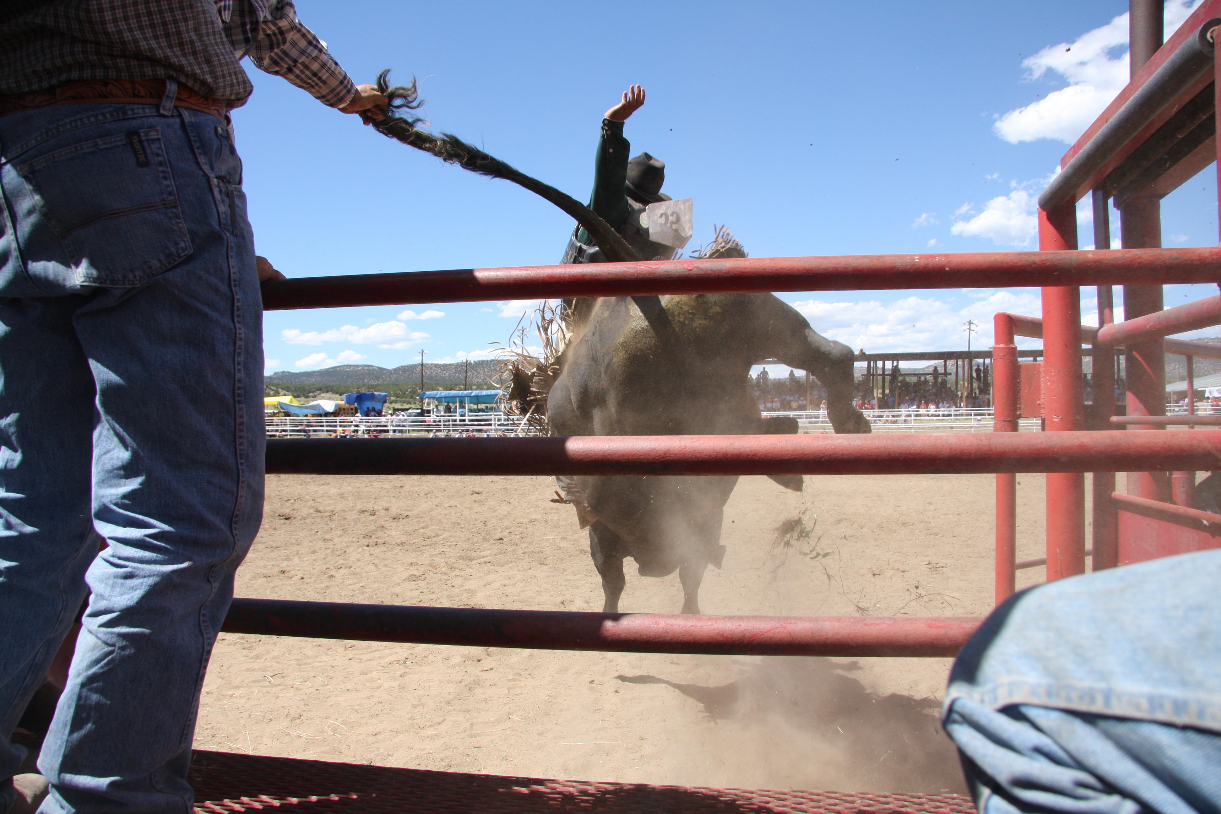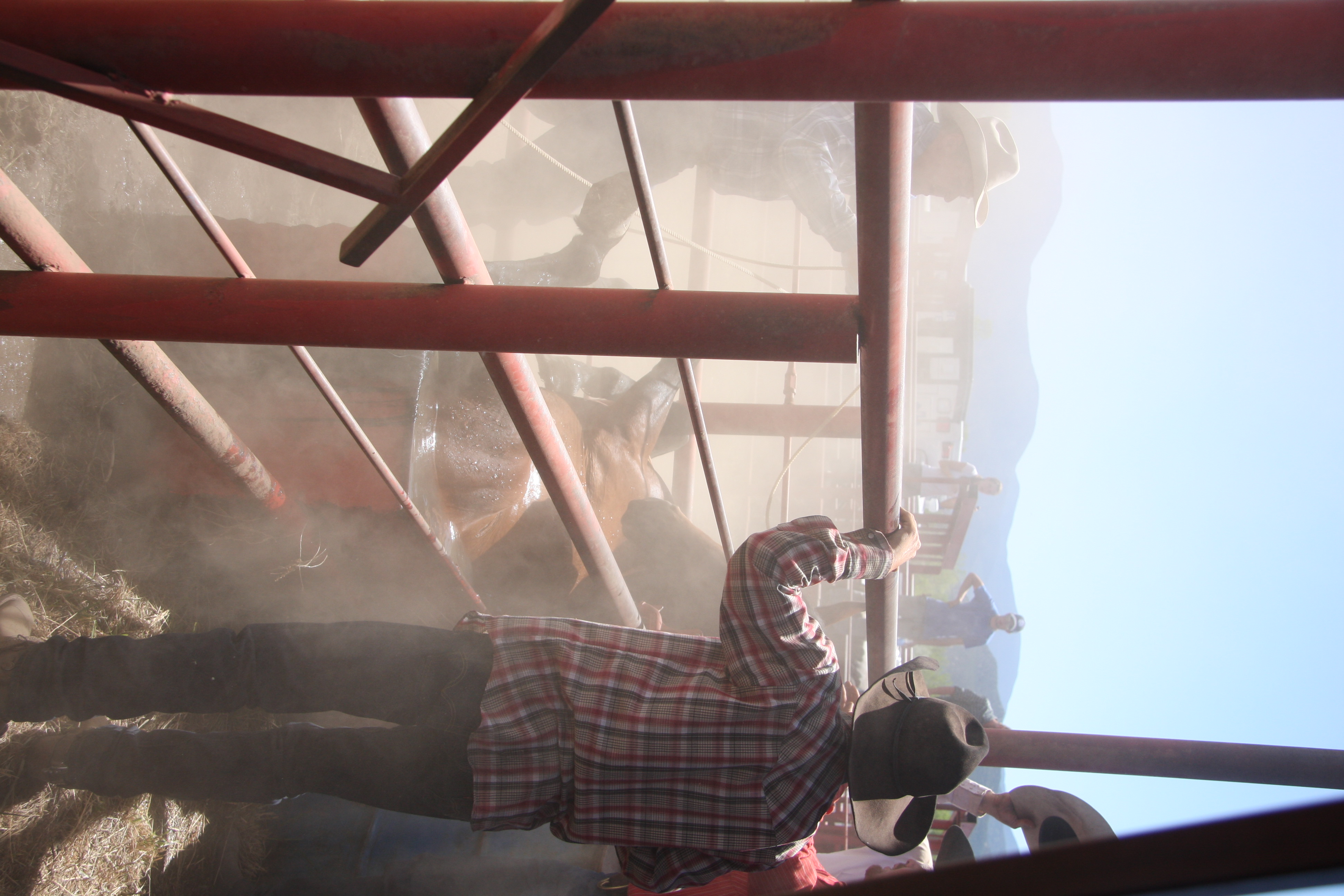 This photo itself isn’t very good. The problem is you can hardly see anything. A horse fell into the water tank at the rodeo. I watched the horse fall in and then all hell broke loose. The other horses in the pen started freaking out and stirred up the dust. Someone jumped in the pen threw a lasso around the horses neck while another man on horseback grabbed the other end and started pulling. About 20 other men down in the chutes started pushing the horse out.