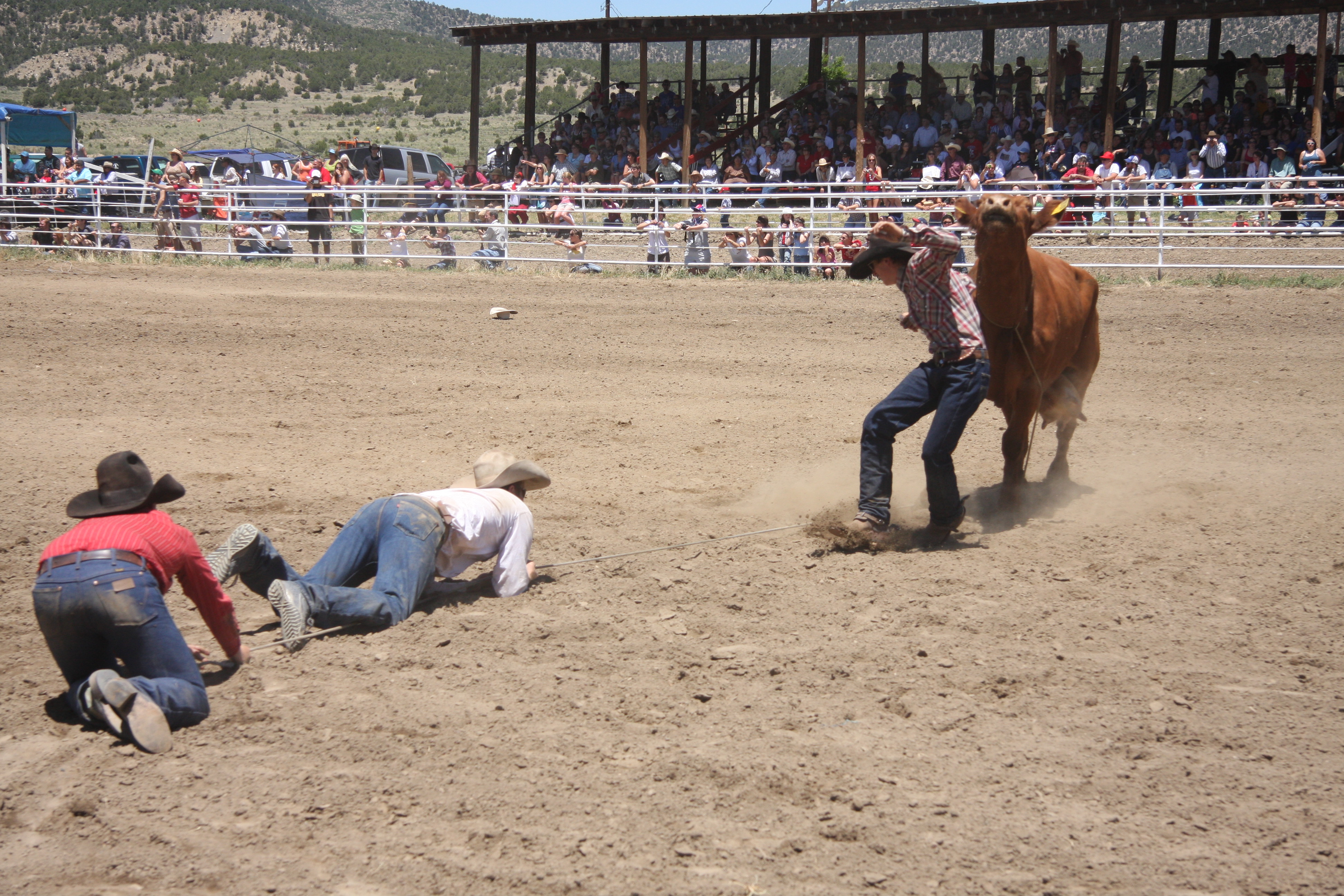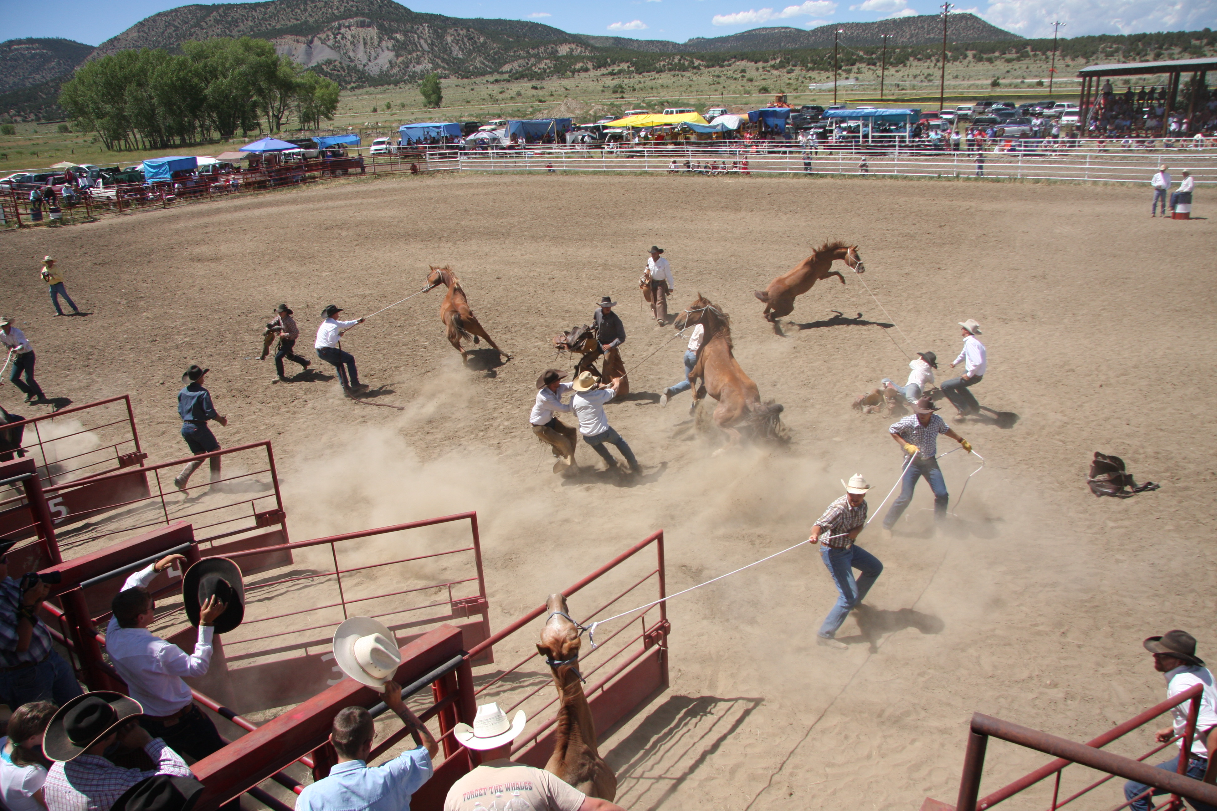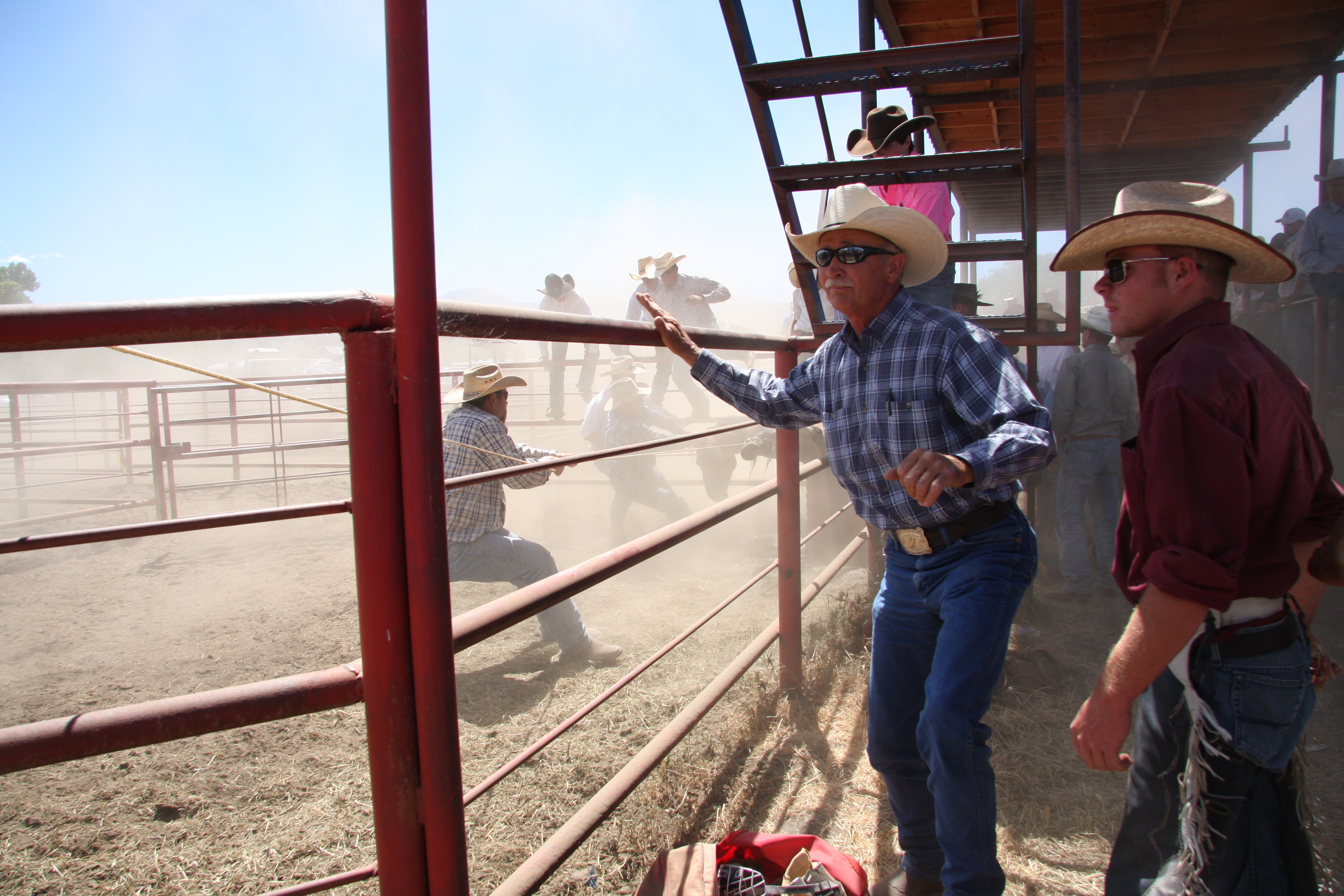 This photo itself isn’t very good. The problem is you can hardly see anything. A horse fell into the water tank at the rodeo. I watched the horse fall in and then all hell broke loose. The other horses in the pen started freaking out and stirred up the dust. Someone jumped in the pen threw a lasso around the horses neck while another man on horseback grabbed the other end and started pulling. About 20 other men down in the chutes started pushing the horse out.
